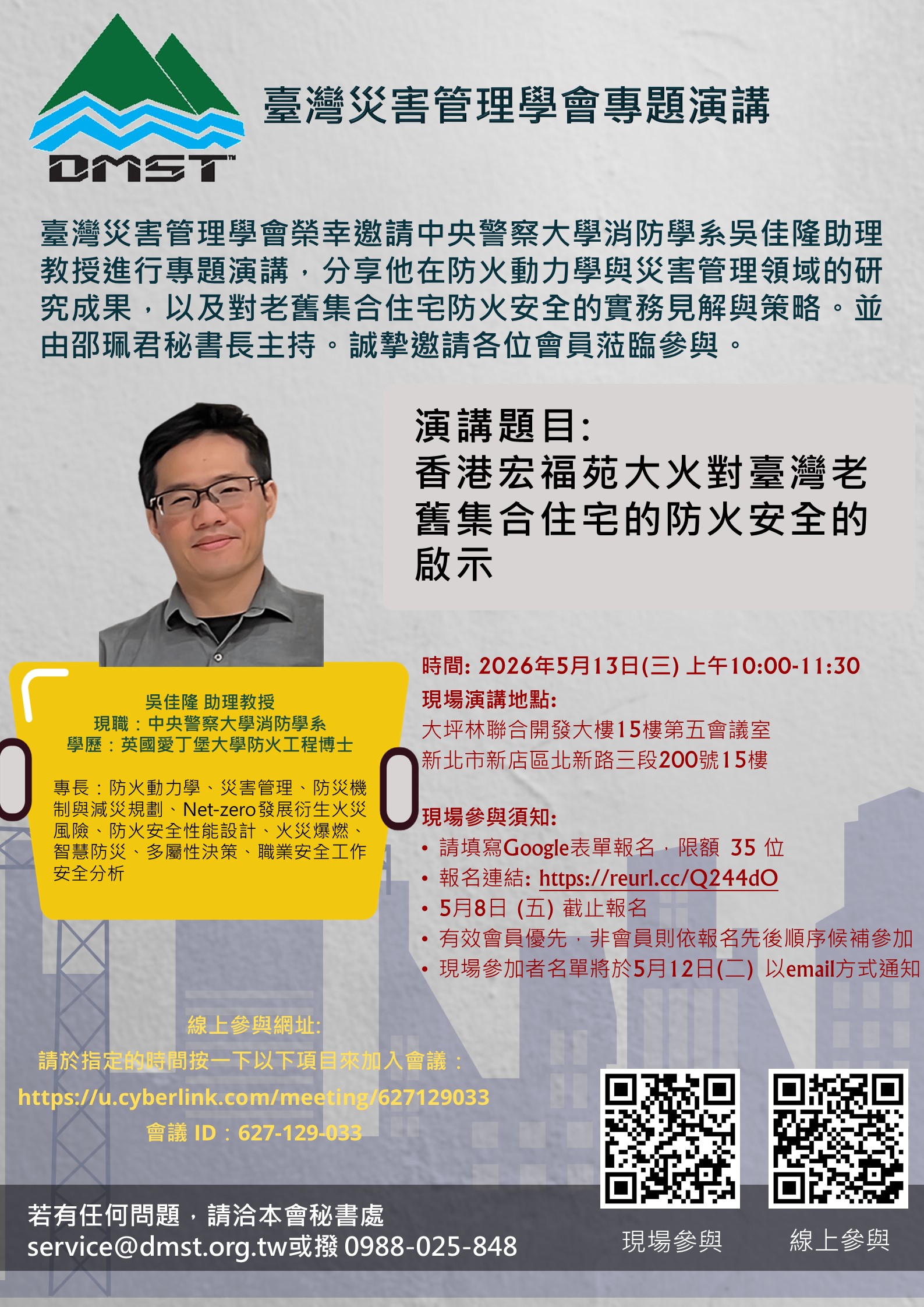 We are honored to invite Assistant Professor Chia-Lung Wu from the Department of Fire Science at Central Police University to share his research on fire dynamics and disaster management. Using the Hong Kong Wang Fuk Court fire as a case study, he will discuss its implications for improving fire safety in Taiwan's aging multi-unit residential buildings. Both in-person and online participation are available. Due to limited capacity, early registration is encouraged.